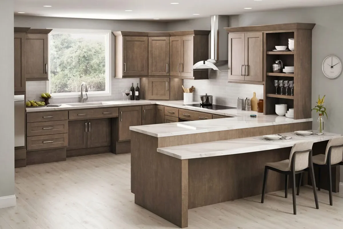 Choose materials that combine durability with warmth: quartz countertops, brushed metal fixtures, soft-close drawers, and natural colors like sage, cream, or walnut.